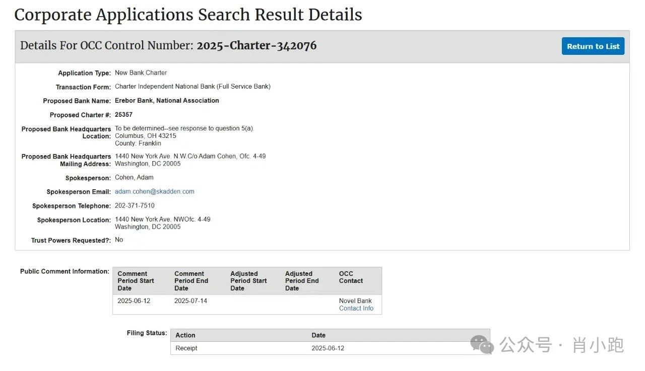 我搜了半天,找到了Erebor银行向美国货币监理署(Office of the Comptroller of the Currency, OCC)提交的国民银行执照申请("Erebor Bank, NA, Columbus, OH (2025)")。