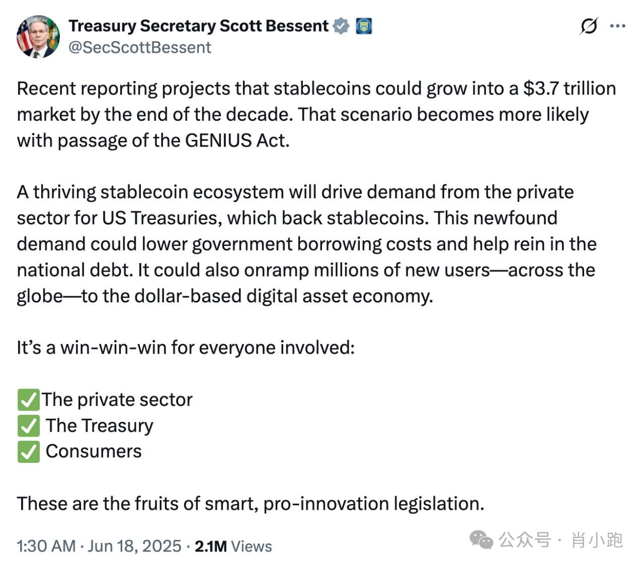 说到这里,想起贝森特老师在X上的发言:估计稳定币可能吸收3.7万亿美元国债。