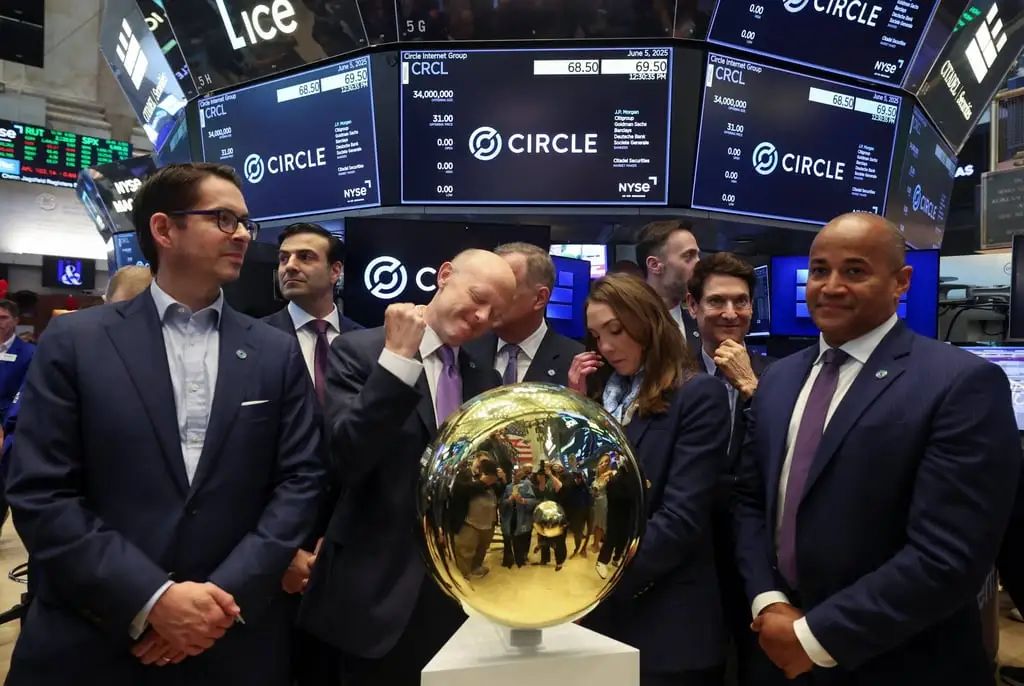 6 月 5 日,全球最大的稳定币发行商之一 Circle Internet Group 首席执行官兼联合创始人 Jeremy Allaire(左三)和 Circle 总裁 Heath Tarbert(左二)在公司首次公开募股当天的纽约证券交易所。