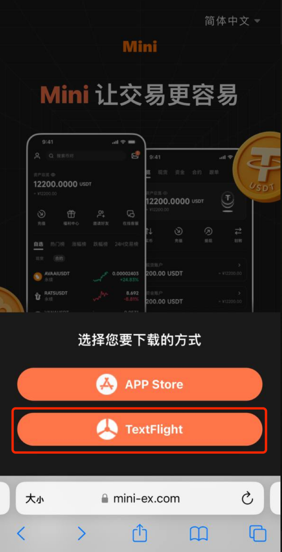 - 您需要返回Miniex APP下载页面,点击TestFlight下载