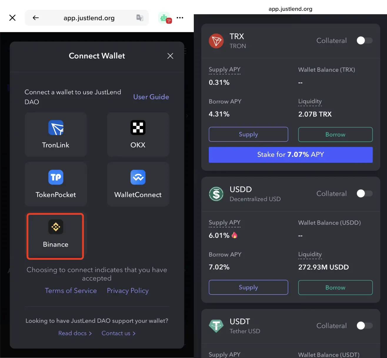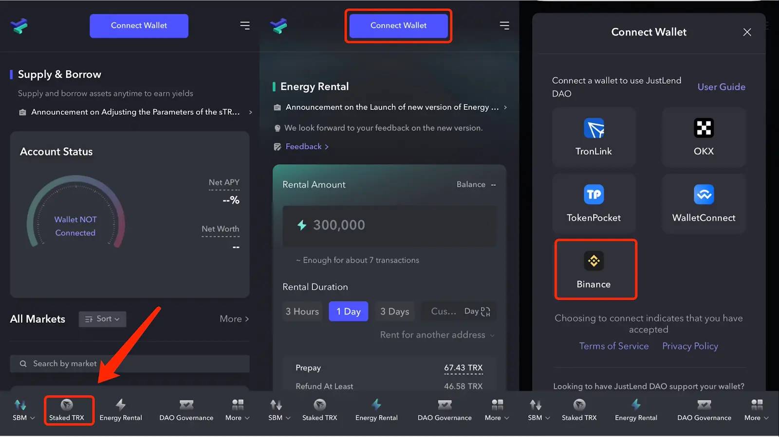 1、首先在 JustLend DAO 导航页进入“Energy Rental”页面,连接Binance 钱包。