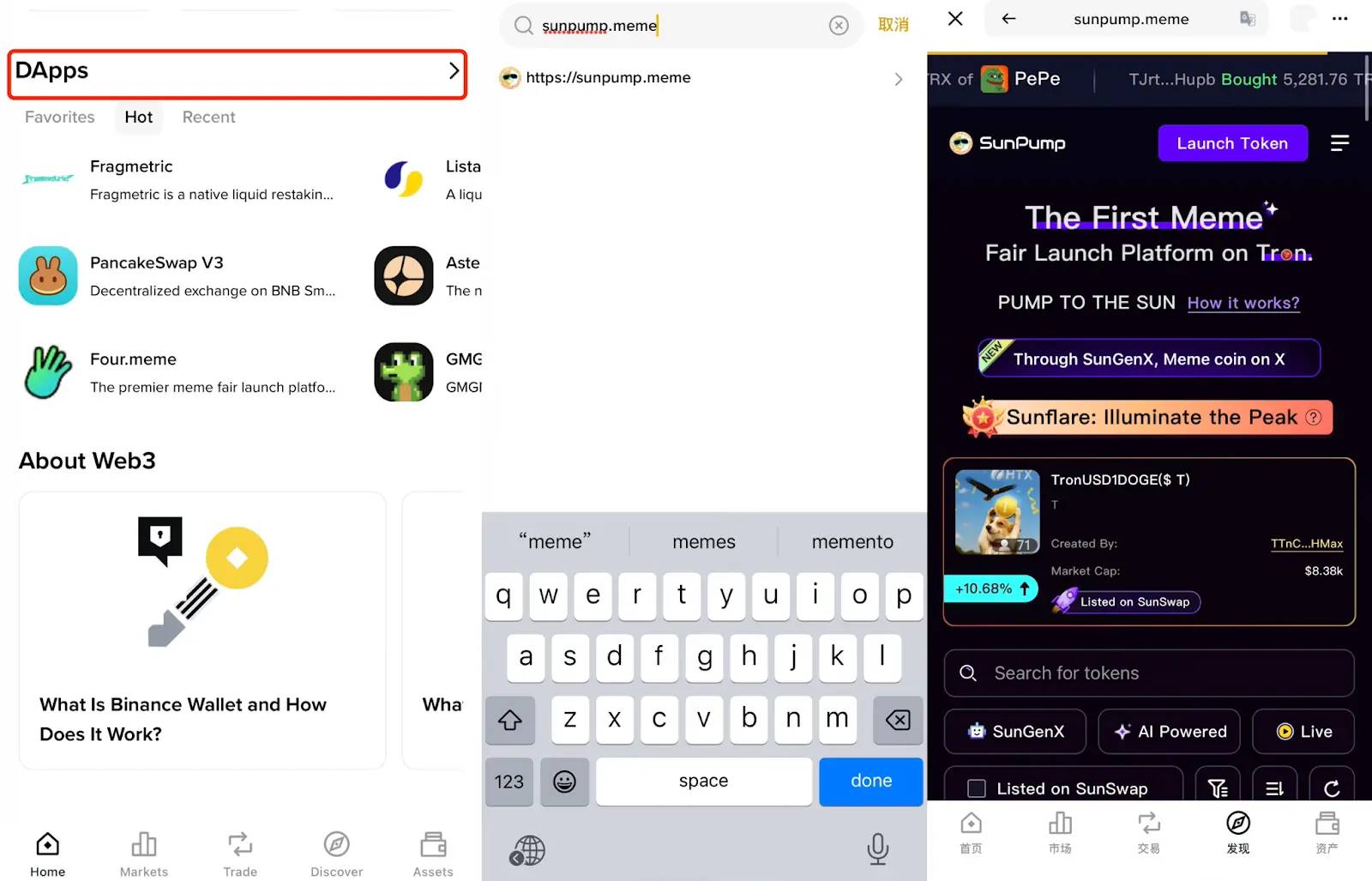 1、进入SunPump:在Binance 钱包的DApps 界面输入SunPump 网址(sunpump.meme),进入SunPump 应用页面。