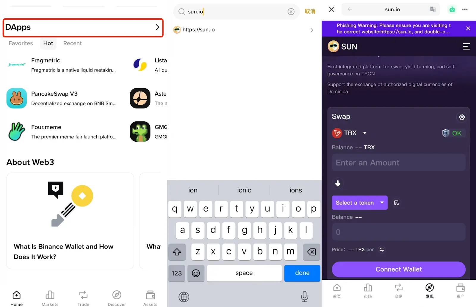 1、进入SUN.io:在Binance 钱包的DApps 界面输入SUN.io 网址(sun.io),进入首页的Swap 板块。