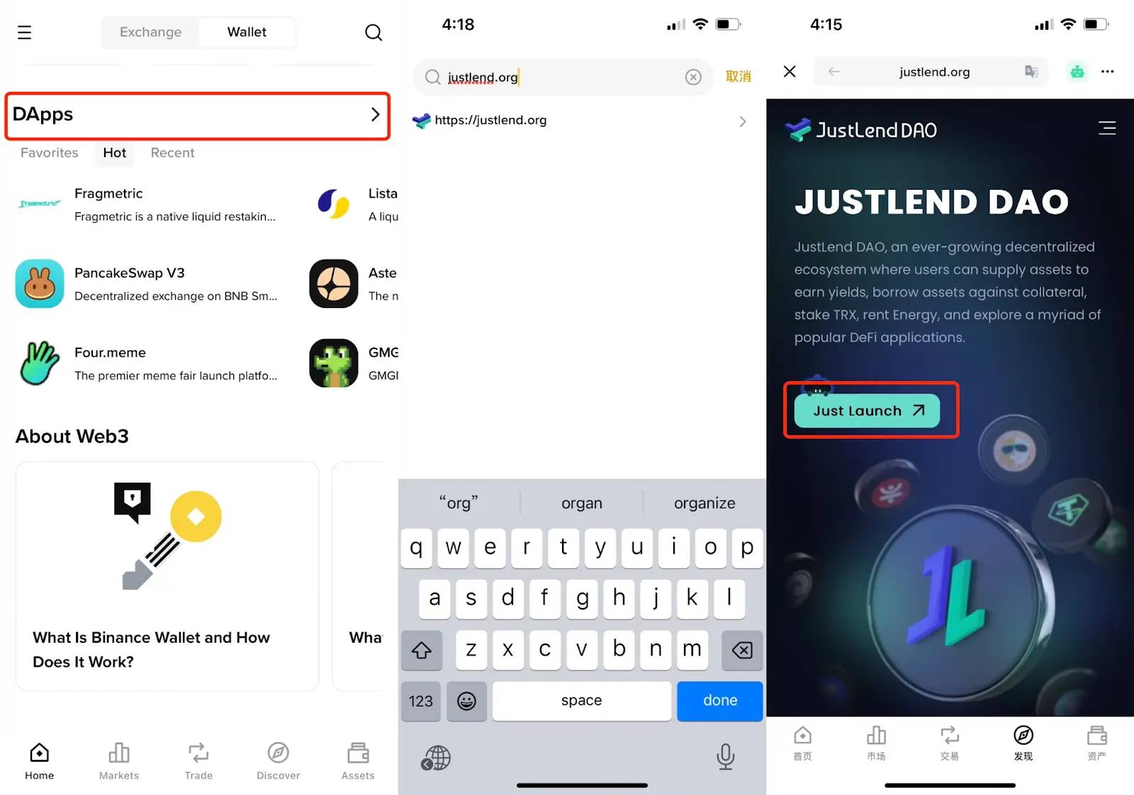 1、进入JustLend DAO: 在Binance 钱包的DApps 界面输入JustLend DAO 网址(justlend.org)进入官网,接着点击“Just Lanuch”,进入应用页面。
