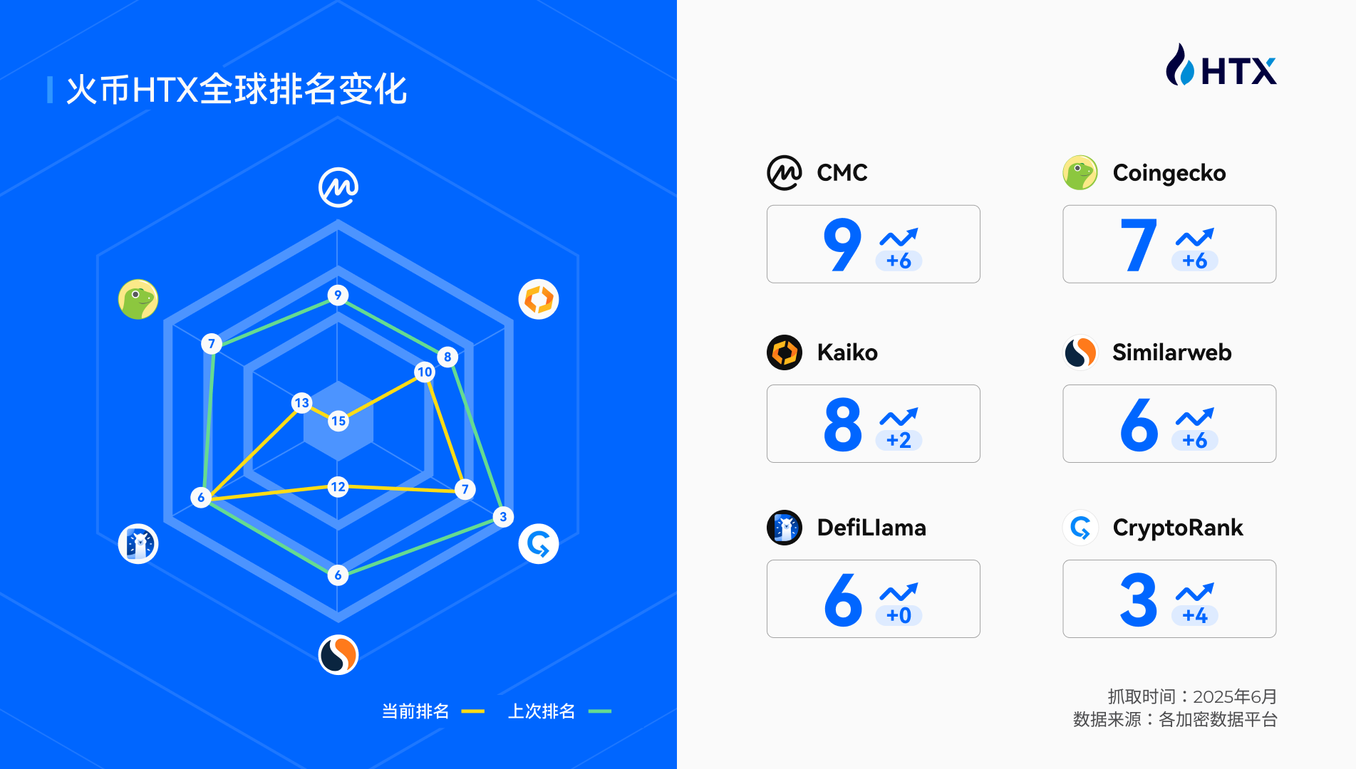 根据Kaiko 2025年第二季度报告,火币HTX在全球45家主流现货交易平台中排名上升两位,成功跻身全球前八,成为Top 10中进步幅度最大的交易所。在商业和技术两个维度中排名全球第二,在“安全”领域亦处于行业前列。此外,火币HTX在CoinGecko、CoinMarketCap、DefiLlama、CryptoRank等全球权威数据平台中的排名持续上升,逐步跻身Web3用户心中的一线平台。