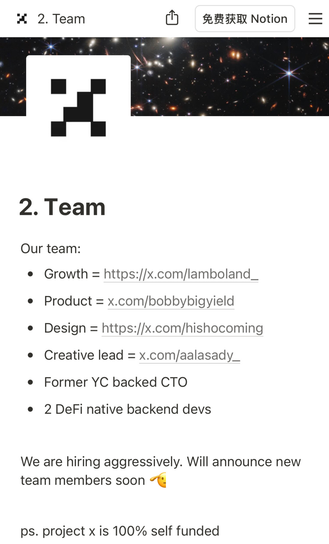 据官方文档显示,目前暂未明确项目创始人身份,但团队主要成员共 7 人,其中 Lamboland 负责增长板块,BOBBY 负责产品运营,hisho 负责产品设计,Ali 负责创意指导。此外还有 YC 背景的 CTO,和两名 DeFi 原生后端开发人员。