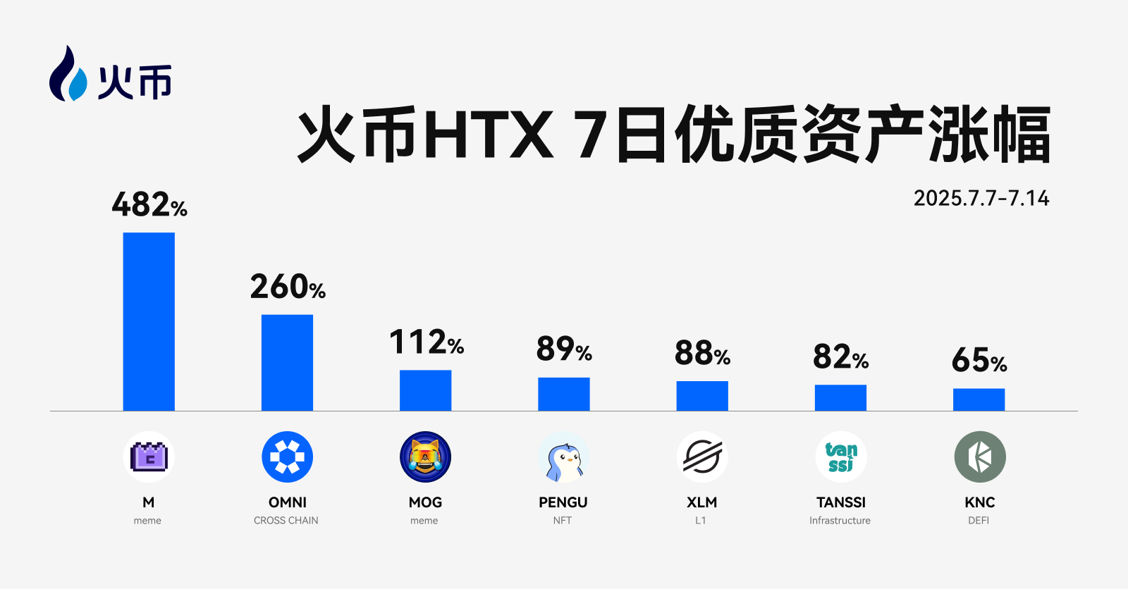7月中旬,比特币强势突破12万美元,再次刷新历史新高,加密市场热度空前。伴随情绪回暖与资金轮动,火币HTX新上线资产再次释放强烈财富效应,成为本轮行情中投资者布局热点的关键场域。7月第二周(7.7-7.14),火币HTX上线的多个新币表现亮眼,尤其是Meme、NFT与基础设施板块涨势喜人。火币HTX将持续优化上新策略,优中选优,为用户捕获早期潜力币种交易机会,打造行业红利的“财富入口”。