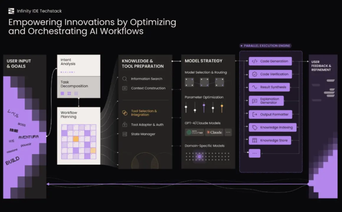 在交互方式上,Infinity Ground 引入了 Agentic 编程范式,通过任务分解、上下文理解与模型策略路由等机制,支持从语义出发快速生成功能模块。平台支持多模型协作(如 GPT-4 与 Claude)、动态参数优化、结构化输出与可解释性结果生成,强化了非技术用户在交互过程中的可控性与可理解性。