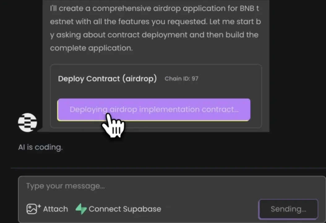 除了页面构建与交互配置之外,Infinity Ground 也率先在同类平台中打通了智能合约的语义生成能力,成为 Vibe Coding 语境下链上逻辑生成的重要探索者。平台内置合约生成与部署模块,允许用户仅通过自然语言描述,比如 “create a token airdrop with 1000 recipients” 等 ,即可完成包括 Airdrop、Token 创建在内的一系列智能合约的生成、打包与上链操作,整个过程无需接触 Solidity 编程语言,也无需进行本地编译或环境配置。