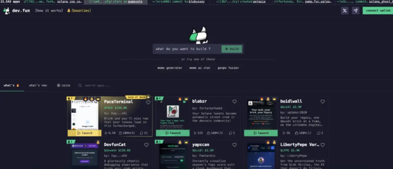Dev.fun 的定位介于二者之间,其目标用户主要是 Meme 创作者与链上内容构建者,支持将文本意图生成具有视觉表现力的内容页面,同时提供基本的钱包连接与数据接口调用功能,结合了轻量语义交互与模板驱动,强调“快速做出可分享作品”,更像是一个面向创作者社群的工具型平台。