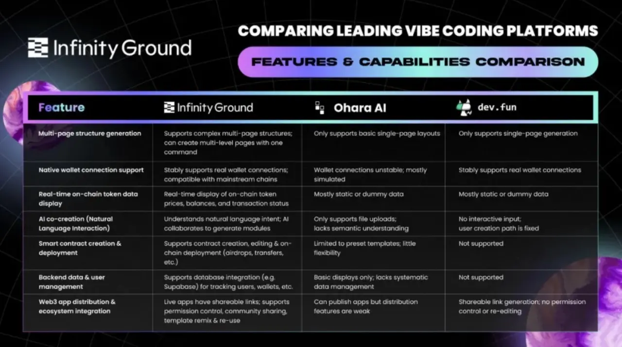 在该领域中,Infinity Ground 、Ohara AI 以及 Dev.fun 等项目逐步脱颖而出,成为当前 Vibe Coding 赛道中具有代表性的探索者。