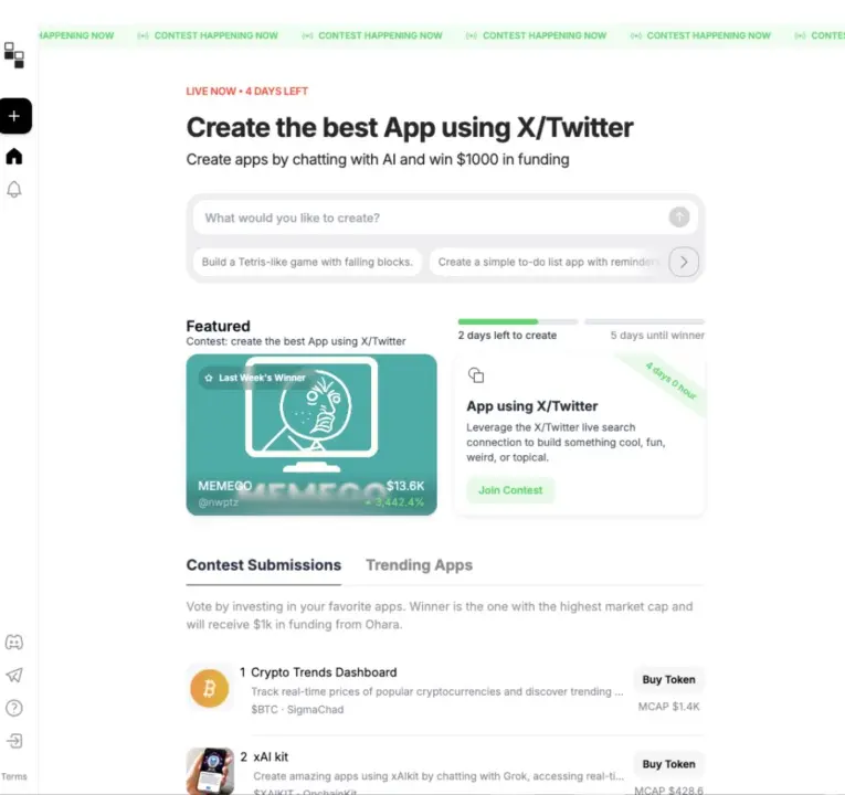 Ohara AI 是 Vibe Coding 赛道中聚焦“构建 激励”的代表性平台之一, 致力于通过自然语言构建可运行的 Web3 应用,并自动发行专属 App Coin,支持激励、交易与社群互动。