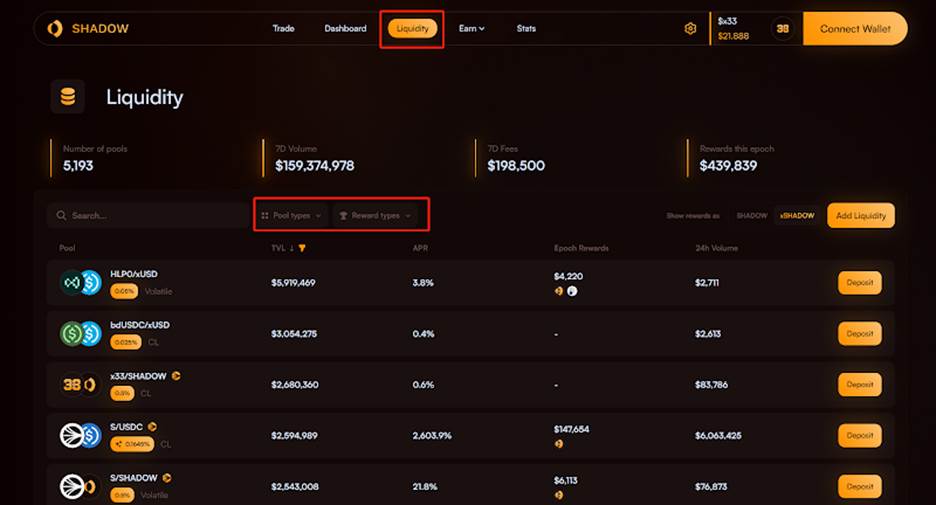 Emissions & Incentives:赚取流动性池 $SHADOW / $xShadow 或其他代币奖励,收益较高但波动较大。