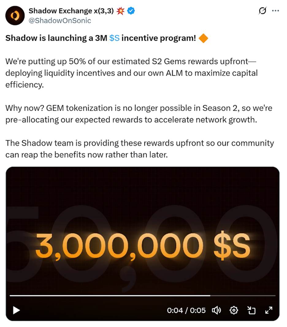 与此同时,由于第二季空投将不再支持 GEM 代币化,Shadow 更是宣布推出 300 万枚 $S 代币激励计划,将第二季空投预期奖励的 50% 提前释放,用于流动性激励和主动做市策略(ALM),进一步激励用户参与推动生态增长。