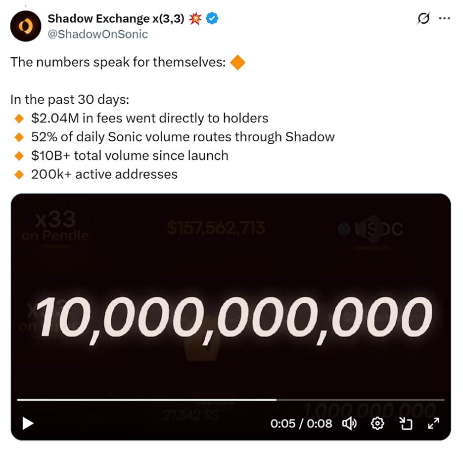 本轮周期,凭借全方位的性能升级以及 DeFi 之父 Andre Cronje 的深度参与,Sonic 区块链以「更纯粹的 DeFi 基因」之名,重新点燃了市场对 DeFi 的期待与热情。而作为 Sonic 生态交易量最高、收入最高的 DeFi 项目,Shadow Exchange 无疑是其中主推力。