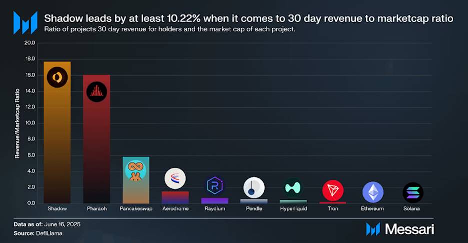 而若站在 30 天项目收入 / 市值比例角度,Shadow 更是凭借更小市值、更高收入优势冲向榜首,超出第二名 Pharaoh 约10.22%,甚至超过 Raydium、PancakeSwap、Aerodrome 等知名协议,成为能够与以太坊、Solana、Tron 和 Hyperliquid 等成熟网络并驾齐驱的项目。