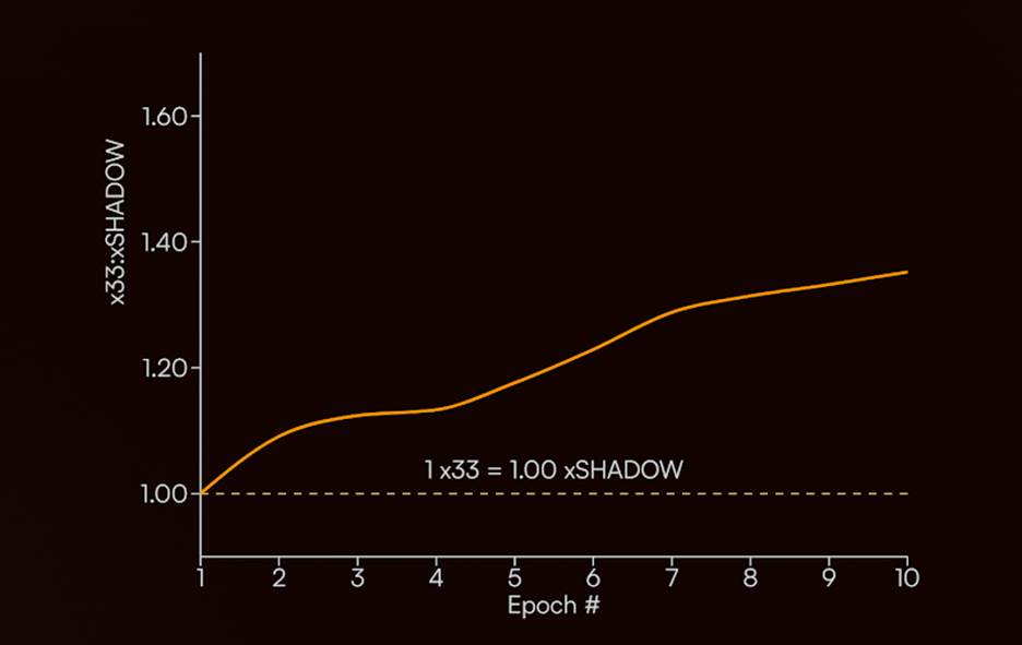 x33 :xShadow 作为 $x33 的本位资产,其价值通过手续费和奖励持续累积,$x33 的市场价格不会低于 $xShadow 赎回价值。