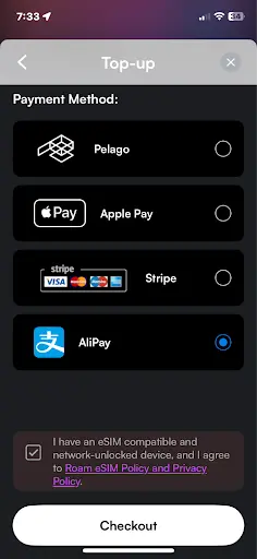 支持绑定信用卡自动续费,也支持支付宝、 USDC/USDT等支付方式,即将开通 ROAM 代币充值,多种途径确保通信服务始终在线。