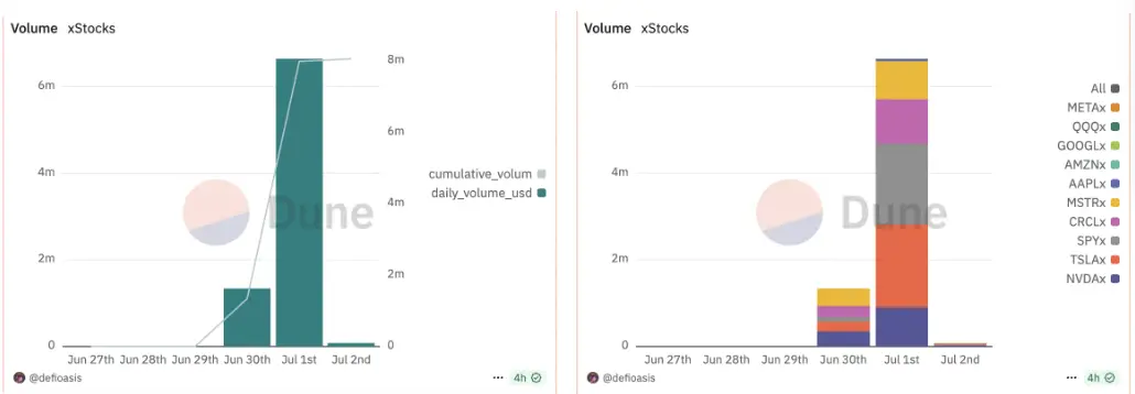 相比之下,Kraken 与其合作方推出的 xStocks 生态体系提供了另一种路径想象。该方案以 Solana 链为基础,由 Backed 提供底层资产代币,通过结构化合规方式绕开美国监管,将产品面向全球非美市场开放。xStocks 最大的特色在于其交易属性的“DeFi 化”:所有代币可 24/7 全天候交易,具备 T 0 结算、链上互换、与稳定币做市等功能,理论上能够整合入现有 DeFi 工具链如借贷、永续合约、跨链流动性桥接等。该体系也尝试通过链上流动性池的方式聚集交易深度,并与 Orca、Jupiter 等 Solana 原生 DEX 建立初步连接。这种链上原生、全球分发、可组合的属性无疑代表了代币化股票的“终极愿景”,即不仅仅做成价格映射产品,而是构建一个真正融合传统金融资产与加密基础设施的交叉市场。然而,xStocks 目前的最大难题仍在于用户覆盖范围受限、真实申购/赎回仍需 KYC 审核,以及其托管路径是否具备跨国法律效力尚无定论。此外,虽然其交易体验与机制已达“加密原生”标准,但实际用户规模和链上流动性仍未形成规模效应,距离主流采用仍有较长路要走。
