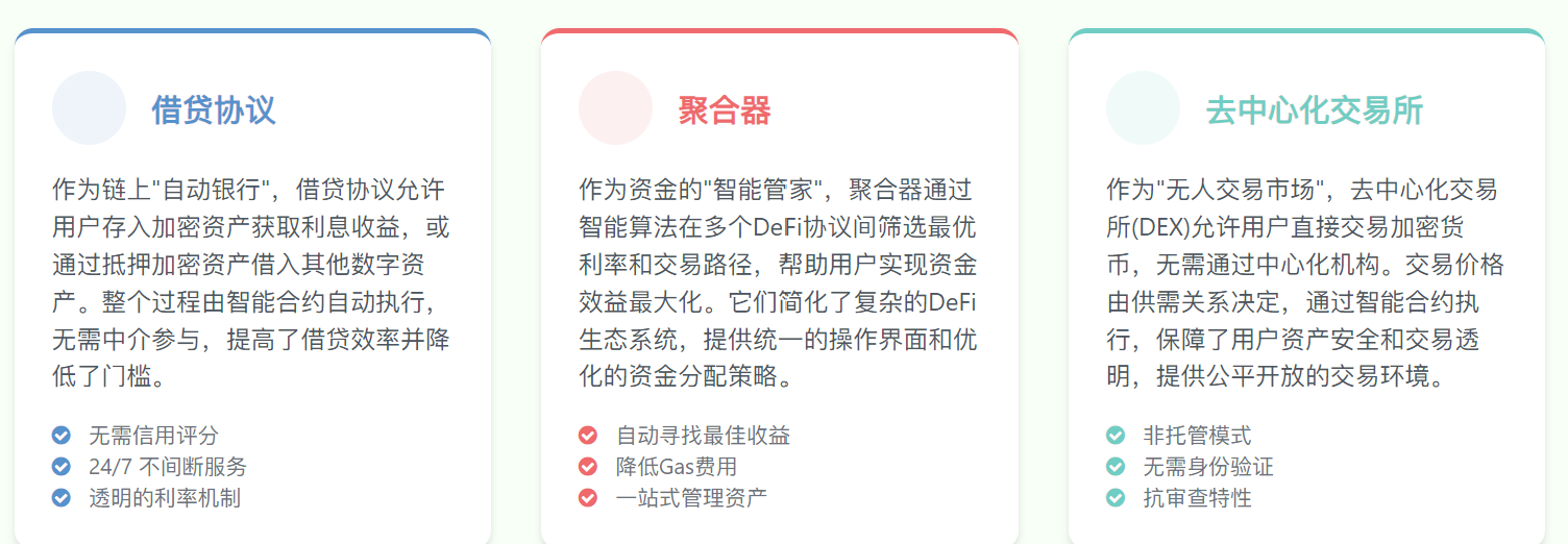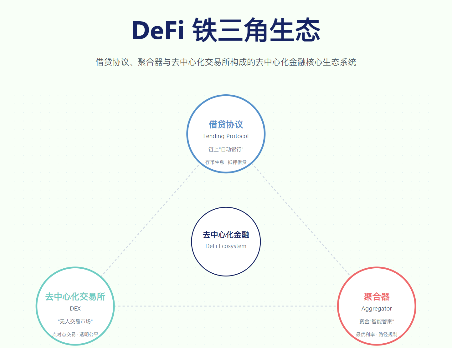 2015 年以太坊智能合约技术的突破,为 DeFi 的崛起提供了技术支撑。智能合约使金融规则以代码形式自动执行,无需传统中介机构参与,改变了金融交易模式。在 DeFi 生态中,「DeFi 铁三角」 发挥着关键作用。本质上,DeFi 复刻了传统金融的核心功能,借助区块链技术实现了 「无中介、全开放、自动化」,为金融体系带来了新活力。
