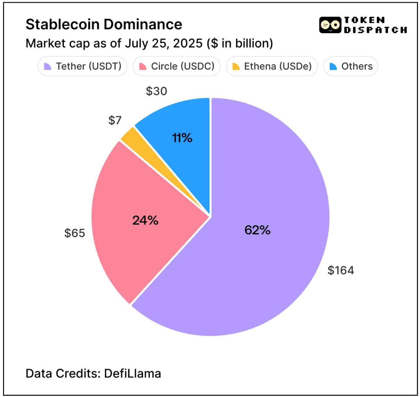 截至 7 月 25 日,Tether 在稳定币行业的主导地位已降至 61.76%,自 2024 年 11 月的 69.69% 下降了八个百分点。同期,Circle 的市场份额增加了四个百分点,达到 24.44%。