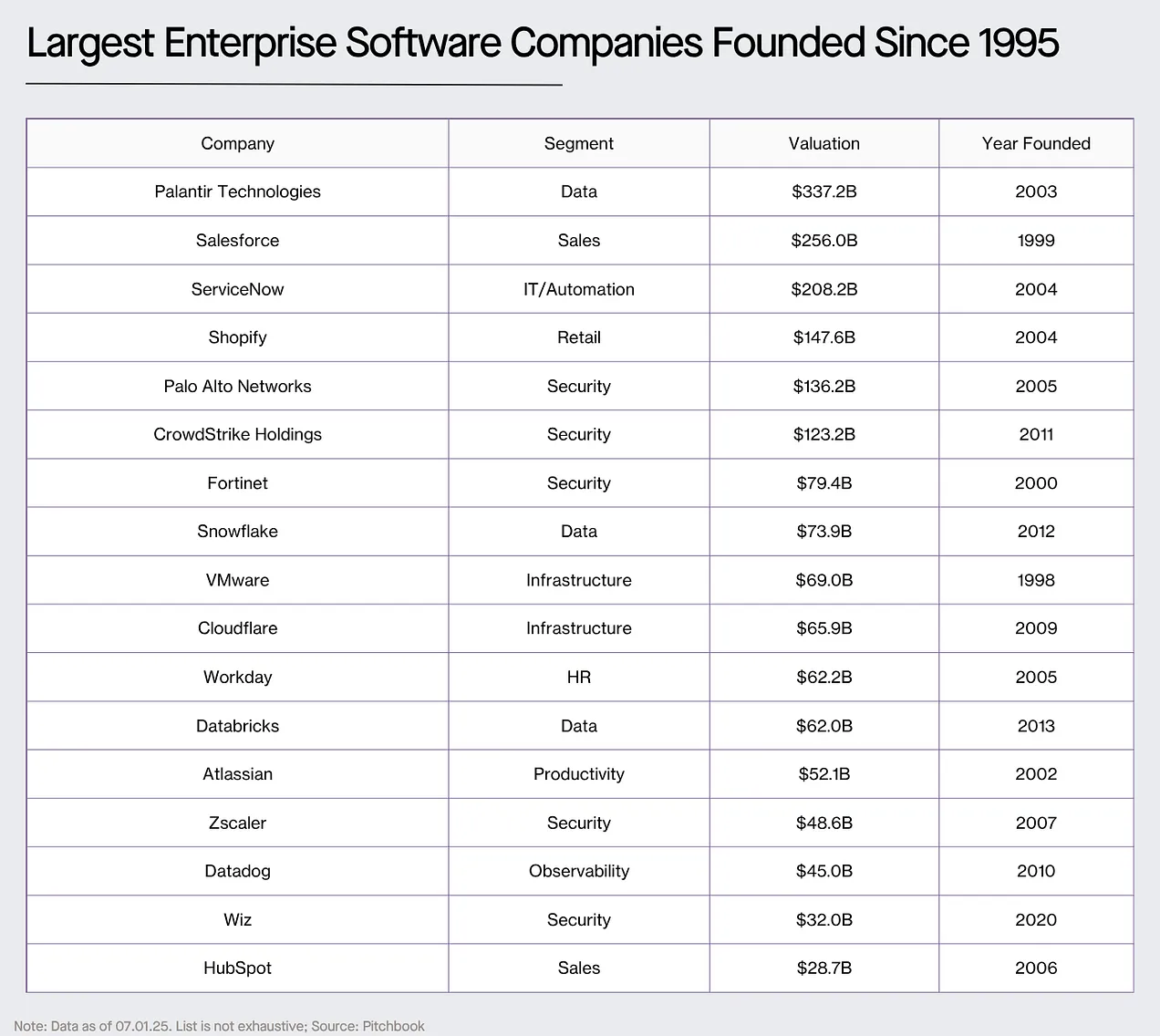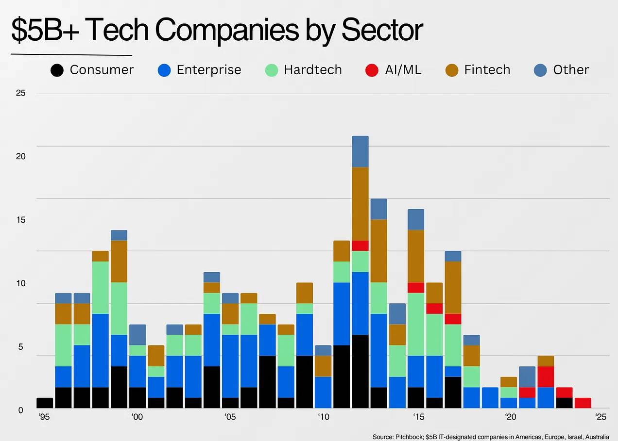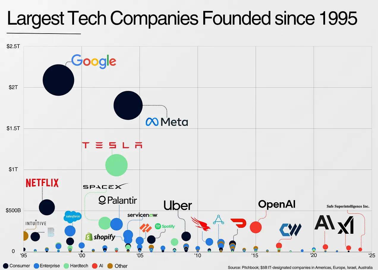 关于方法论:绝大多数技术价值都集中在最大的公司身上,因此我选取了自 1995 年以来成立的所有 Pitchbook 上标有 IT 价值 50 亿美元以上的公司。 (注意:这不包括亚马逊、Nvidia、微软和苹果。)我让 Claude 帮助对这些公司进行分类,因此我认为确切的数据在方向上非常准确,但在本质上并不准确。