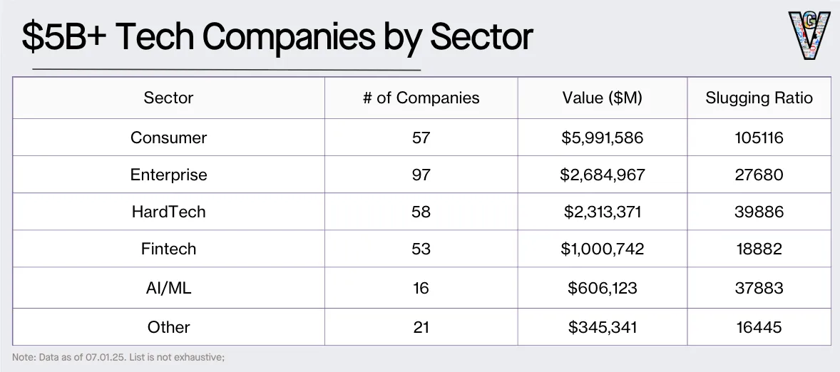 大部分价值是由消费品公司创造的(受幂律主导)。然而,企业软件公司的数量几乎是消费品公司的两倍。