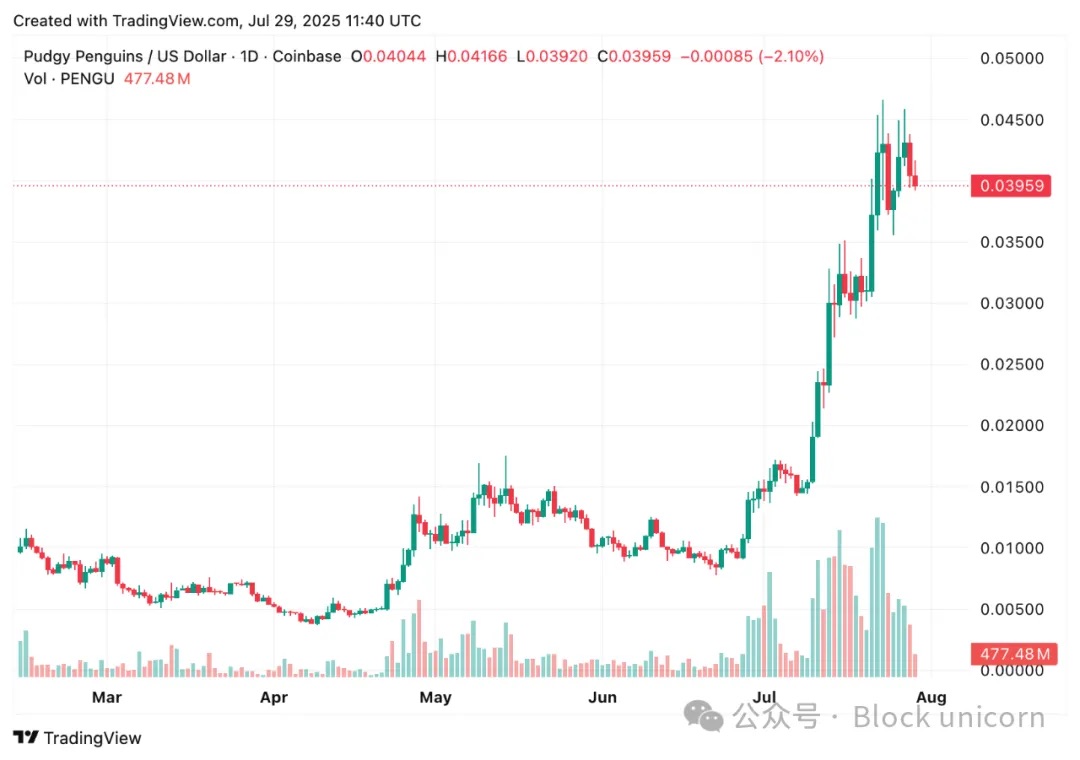 到 2025 年中期,随着大户积累的增加和每日交易量突破 25 亿美元,PENGU 在短短几周内飙升超过 300%,其市值超过 25 亿美元。