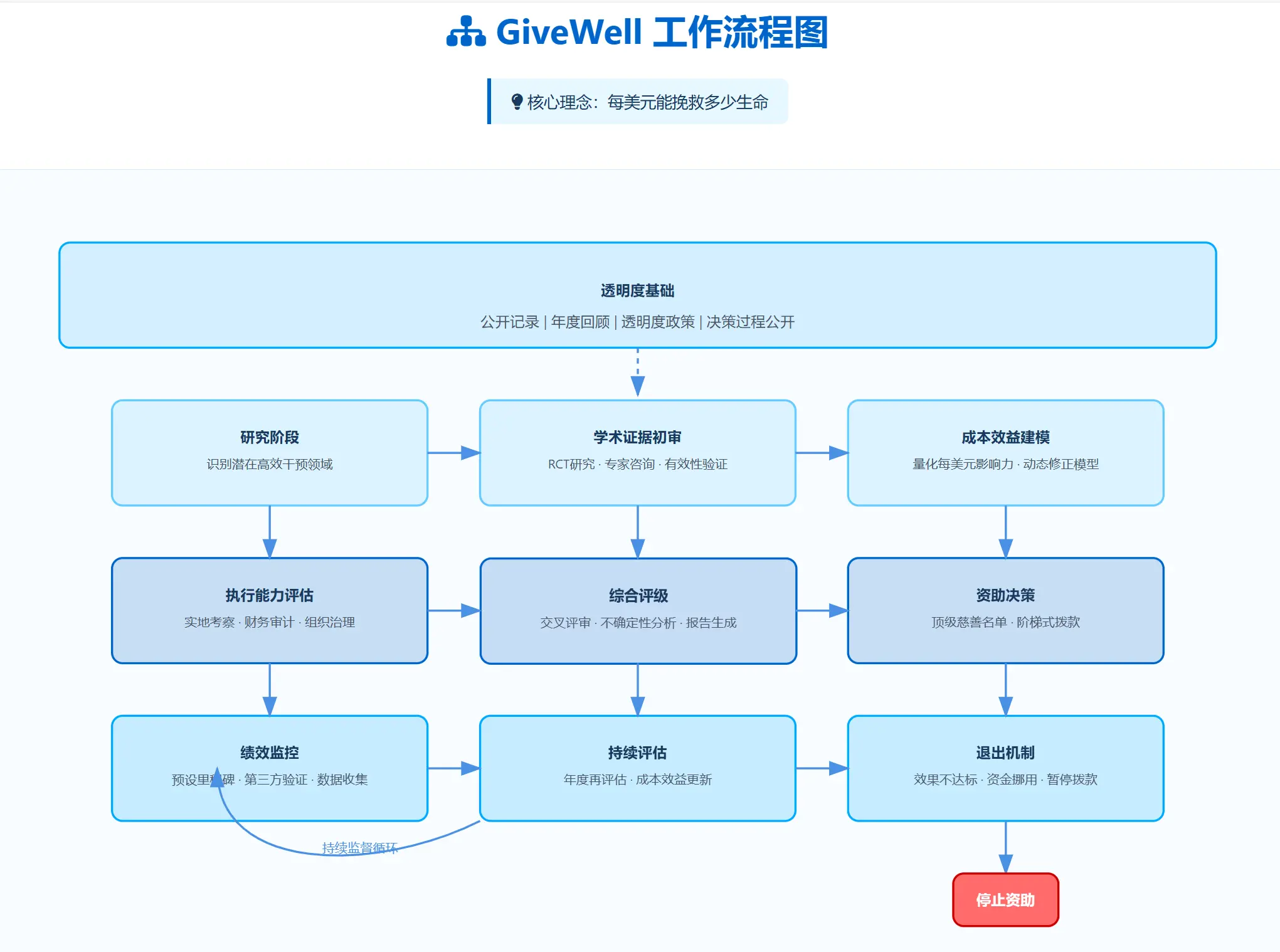 GiveWell治理中的一大亮点是高度透明。官网专门设有"公开记录"、"年度回顾"、"透明度政策"等栏目,向公众开放包括财务报表、运营策略和决策过程在内的详细信息。其组织价值观也明确将"透明"列为核心之一。GiveWell对每个募资项目的评价流程多步骤严谨:首先查阅独立学术研究(如随机对照试验),并咨询领域专家,确认项目是否确实达成其目标;随后构建详细的成本效益模型,通过预算和监测数据不断修正,以估算投入每美元能产生多少改善(例如挽救多少生命);还会对潜在受资机构进行访谈与实地考察,以核实实际执行情况;评估中亦会审核组织的财务透明度和既往绩效记录,最后形成书面报告和定量指标。在项目获资后,GiveWell承诺持续跟进其进展:如果发现目标无法有效实现,团队会及时停止资金支持。这一整套以证据为导向的评估流程,确保了资金所用项目的高性价比和持续监督,区别于传统仅依赖机构自报业绩的捐赠评估方式。