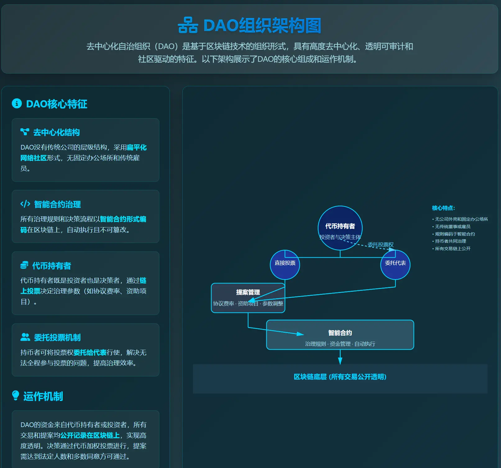 从结构上看,DAO通常是"无公司外壳、无固定办公场所的网络社区"。DAO没有传统意义上的董事或雇员,其治理规则和决策流程皆以智能合约编码在区块链上,由持币人共同执行和监督。例如,DAO的资金来源多来自代币持有者或投资者,所有交易和提案均公开记录在链上,实现高度透明。代币持有者既为DAO的投资者,也是投票主体,对提案进行链上投票,治理参数(如协议费率、资助项目)通过代币投票决定。与此同时,为了解决个别持币人无法全程参与投票的问题,许多DAO(如MakerDAO)还引入委托投票机制:持币者可将投票权交由他人代表行使,提高治理效率。总体而言,DAO组织架构呈现出高度去中心化、透明可审计和社区驱动的特征。