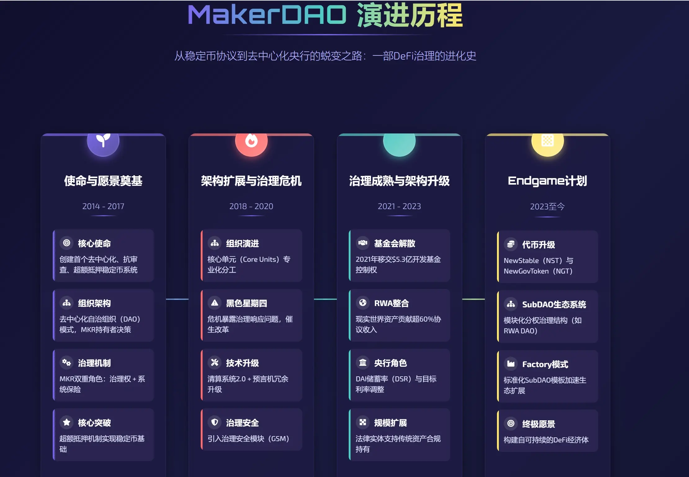 DAO由早期"The DAO"事件中暴露的安全与治理漏洞,逐步演进至以MakerDAO为代表的双代币模型和委托投票机制,进一步到"Endgame"子DAO模块化架构,实现了从单一社区治理向分工更精细、职责更明确的多层治理体系转变。这一演进过程体现了DAO在治理机制设计上的不断成熟和创新。 -