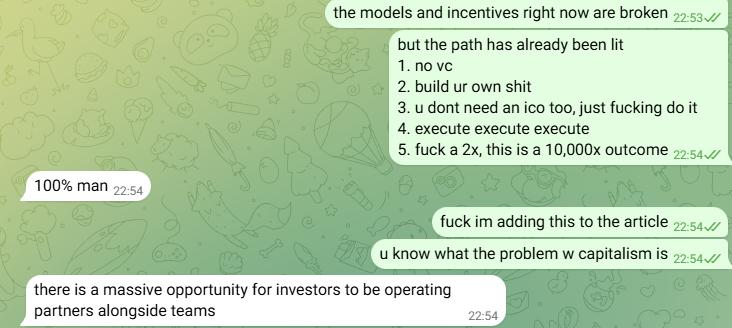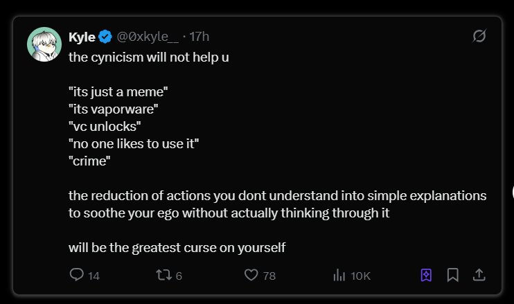 这难道不让人兴奋吗?我们即将进入一个充满机遇的时代——不要让自己的愤世嫉俗心态摧毁曾经的梦想。然而,最让我感到遗憾的是,这一切对任何真正观察到趋势的人来说都显而易见,但我们却忙于追逐随机山寨币的 50% 涨幅,因为过去四年的市场已经让我们习惯了这种模式。是时候放眼更大的梦想了——而成功的蓝图已经摆在眼前。