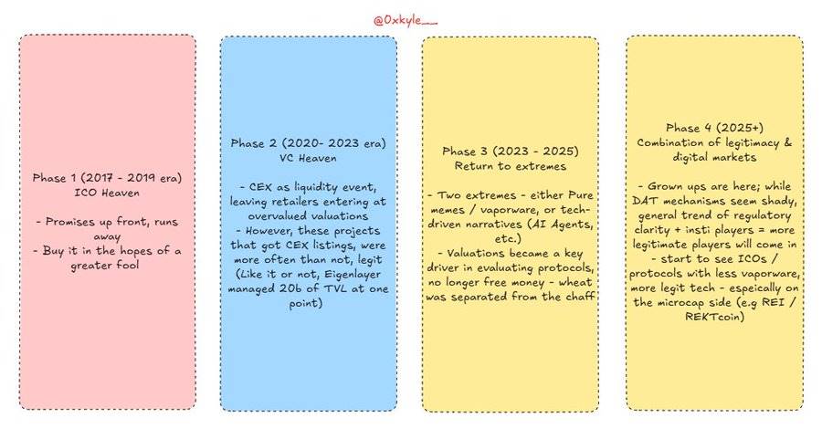 在过去的几个周期中,我们见证了市场融资机制的不断变化。从首次代币发行(ICO),到中心化交易所的山寨币(CEX Alts),再到以 meme 为核心的代币等。我已经在上方的图表中进行了分解,但简单来说: