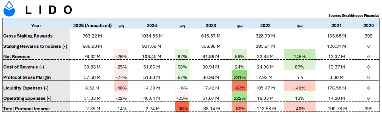 好的方面是 lido 在近年控制成本方面有改善,Liquidity Expense 逐年减少至 25 年 ~$8.5M,Operating Expense 亦自 23 年逐年减少 ~20%。因此在 23/24 年收入大增 (88%/67%) 以及成本减少的情况下,可见项目收入的亏损大幅下跌 (-66%/-93%),去到今年亏损只有 ~$2M。