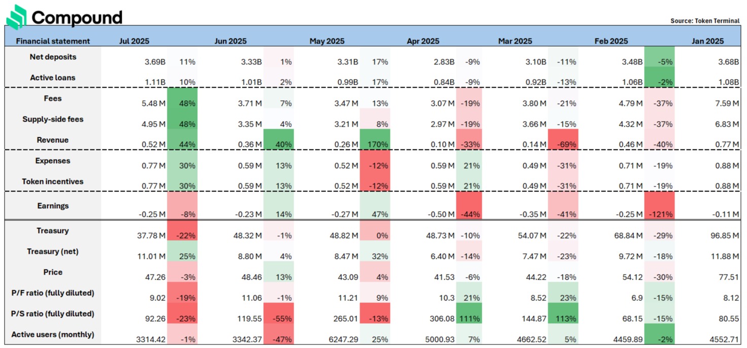 由于资产支持面的局限,Compound 的借贷玩法较为单一,缺乏循环借贷的应用场景与组合策略,导致用户粘性与资金利用率偏低。从财务表现来看,Compound 在 2025 年年初至今录得持续亏损,协议净收益维持在 –$0.11M 至 –$0.25M 区间,同时其代币价格也已累计下跌约 40%。