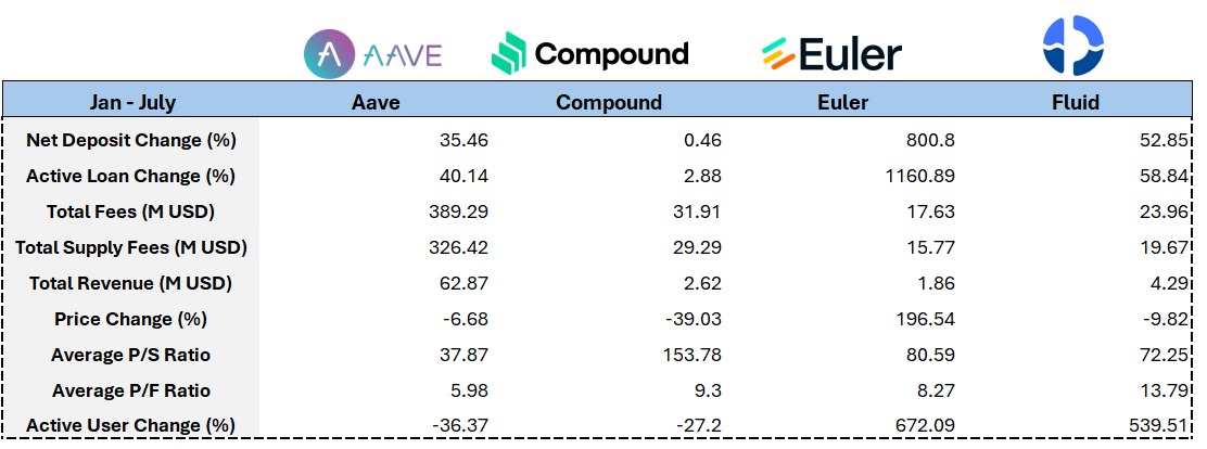 财务报表亦显示 Compound 的 TVL 半年内仅小幅增长( 0.46%),协议收入亦无明显改善,整体增长与 @Aave 间的差距正不断拉大。这也反映出其在产品演进与生态整合方面的滞后问题,若无法在资产支持与功能扩展上加快步伐,或将进一步边缘化于 DeFi 借贷主流之列。