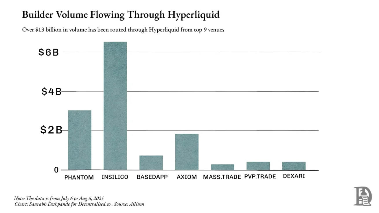 除自有平台外,Hyperliquid 上月通过其他构建者处理的交易量超 130 亿美元。Phantom 通过其路由处理 30 亿美元交易量,赚取超 150 万美元。这展现了 Hyperliquid 当前的强大网络效应。