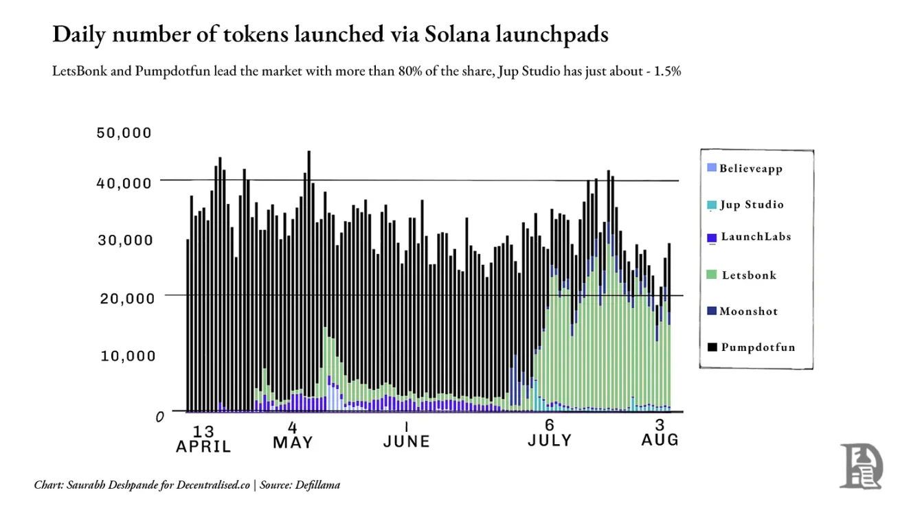 但部分指标的增长尚未显现。以启动板领域为例,市场领导者 Pumpdotfun 和 LetsBonk 控制超 80% 的每日代币发行,而 Jup Studio 和 Moonshot 合计占比不足 10%。下图显示 incumbent 的主导地位。此情况下,默认格局或已固化,Jupiter 或需截然不同的方法破局。