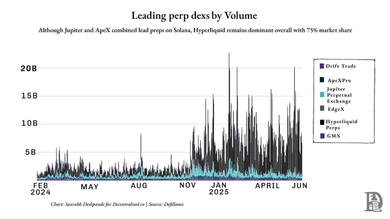 但永续合约或许最暴露此策略的当前局限。Jupiter 在 Solana 上有所进展,但 Hyperliquid 仍以约 75% 的永续 DEX 市场份额主导市场。下图显示 Hyperliquid 在原始交易量上的领先幅度: