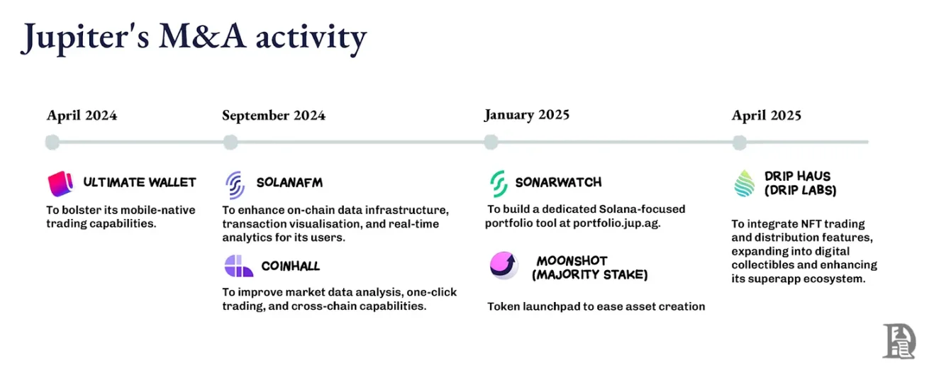 Moonshot 带来代币启动板,将新代币创建转化为 Jupiter 生态内的直接兑换和交易活动;DRiP 添加社区驱动的 NFT 铸造和分发平台,吸引远离交易界面的受众并将其转化为链上行为;Portfolio 收购为活跃交易者提供头寸管理工具。Jupiter 本可以用更低成本内部构建这些功能,但其目标是收购创始人,而非仅功能。