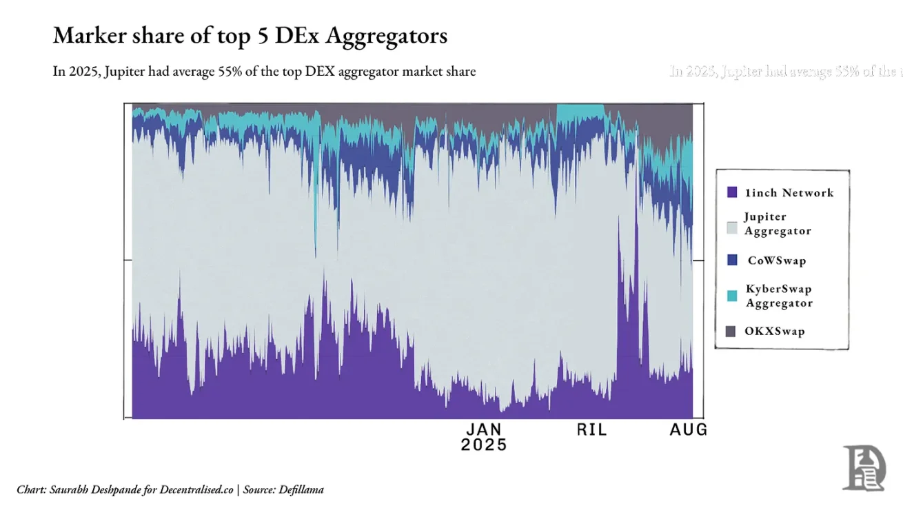 但需注意:尽管 Jupiter 在 Solana 内占据主导,行业层面仍面临激烈竞争。在跨链领域,1inch、CoWSwap 和 OKX Swap 保持重要地位。截至 2025 年,Jupiter 在五大 DEX 聚合器中平均占比约 55%,但该占比随链上活动和集成波动。下图显示 Solana 之外聚合层的分散程度。