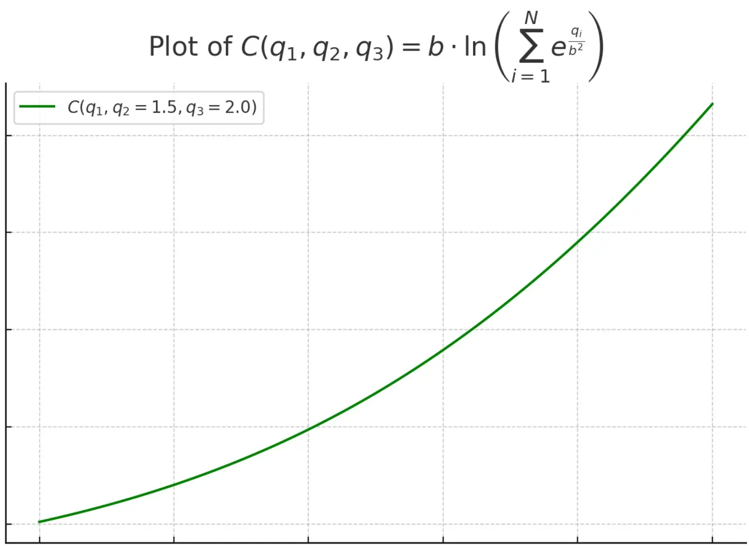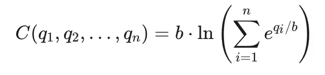 LMSR 的成本函数 C 是根据一个市场中所有可能结果的已售出份额数量来计算的。其公式为: