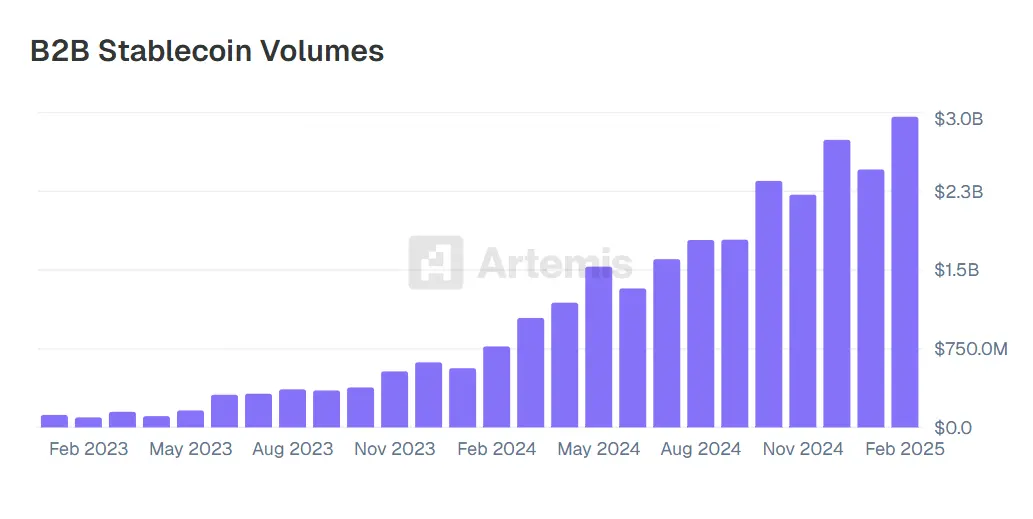 相比C端支付,B2B 企业更渴求低成本、高效率的全球支付方案。稳定币因即时结算、低成本、透明可追溯等特性,正在逐步成为企业间结算的新选择。根据加密风险分析公司 Artemis 和加密投资公司 Dragonfly 和 Castle Island Ventures 发布的《Stablecoin Payments from the Ground Up》报告显示,B2B 稳定币支付规模分布 2023 年 1 亿美元激增 30 倍至 2025 年 2 月的 30 亿美元。稳定币正逐步成为企业的核心金融板块,并激发出广阔的市场空间。