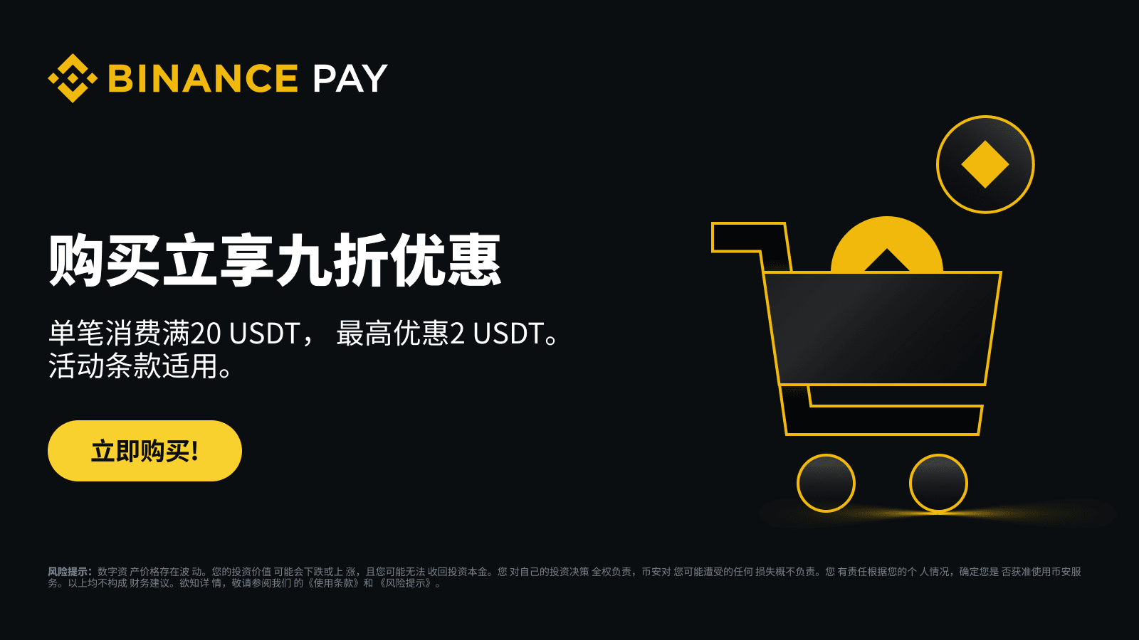在活动期间内,使用币安支付交易且最低消费金额为 20 USDT 时,立即享有一次性 10% 折扣。折扣金额最高不超过等值 2 USDT;