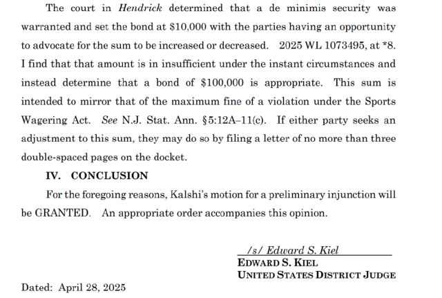 上图为法官 Edward Kiel 裁决准许 Kalshi 对博彩执法部门提出的初步禁令(Preliminary Injunction)的原文