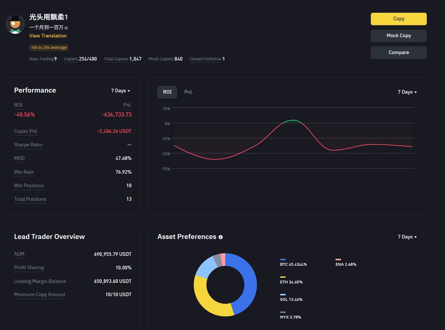 与成功者形成鲜明对比的是,另一位带单员在 MYX 行情中遭遇了毁灭性打击。数据显示,他在 7 天内亏损了超过 63.6 万 USDT,其中绝大部分亏损来自于 MYX 交易。