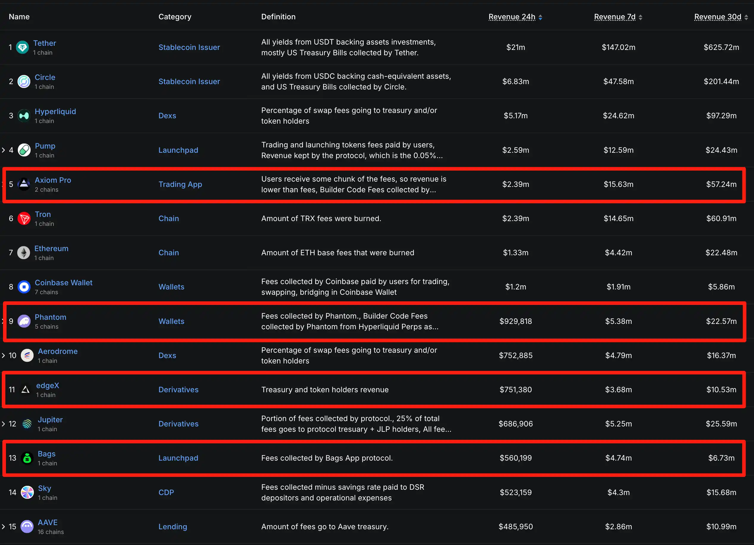 更加耐人寻味的是,把视角拉到全网收入排行榜:在 Top 15 的协议中(剔除 USDT、USDC 这两个稳定币发行方),能够跻身前列却尚未发币的,只剩四家,edgeX 就是其中之一。