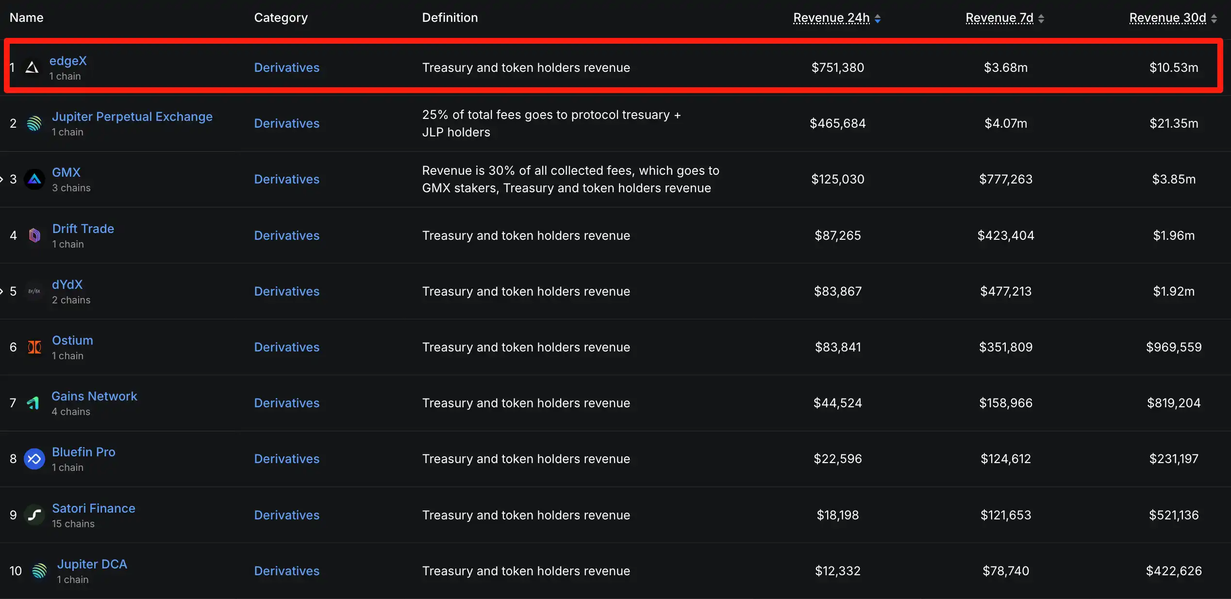 正如文章开头说的那样,产品的优质程度直接体现在收入上,所以对比 perp dex 赛道内部的收入对比,能更直接看出 edgeX 的凶猛。