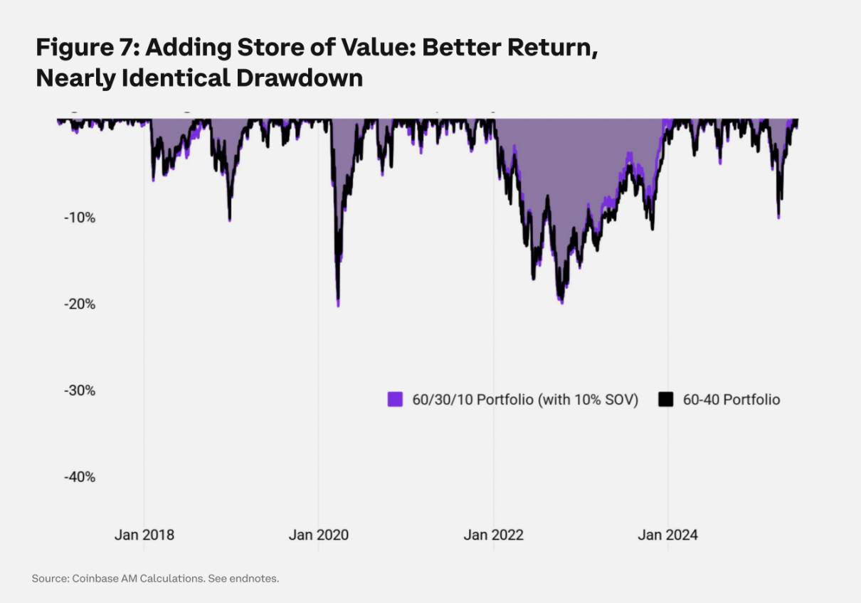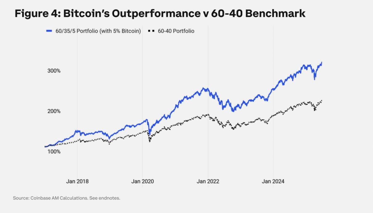 即使是适度的 5% 比特币配置(替代债券配置),相较于 60/40 股票债券基准策略,也能显著改善投资组合表现,为年度投资组合业绩增加近 500 个基点,同时提高风险调整后回报并降低下行波动率。