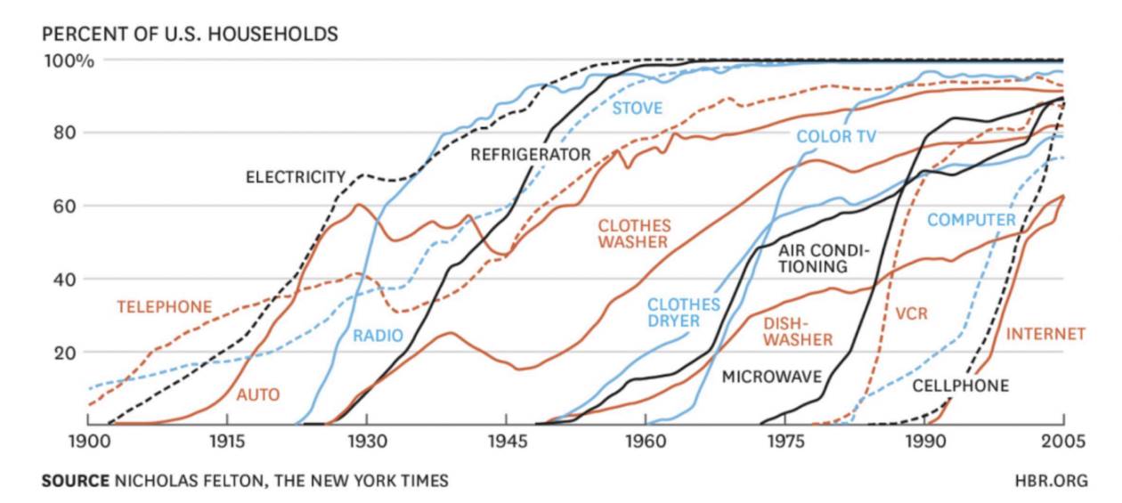 颠覆性技术的发展遵循可预测的轨迹,但其被采用的时间正迅速缩短。电话用了 75 年才达到 1 亿用户,互联网用了 30 年,移动电话用了 16 年,而如今的移动应用仅需几个月就能实现大规模普及。比如,ChatGPT 在不到两个月的时间里就达到了 1 亿用户!Web2.0 平台减少了交易摩擦,但却集中了控制权,获取了大部分经济价值和用户数据。区块链协议则解决了这些缺陷,使货币能够在互联网自由流动,赋予用户所有权,并且无需中介即可运行。